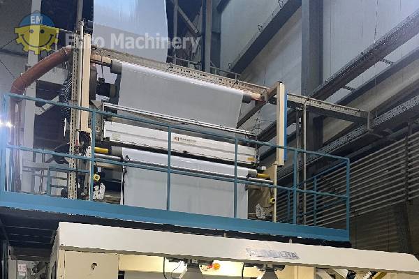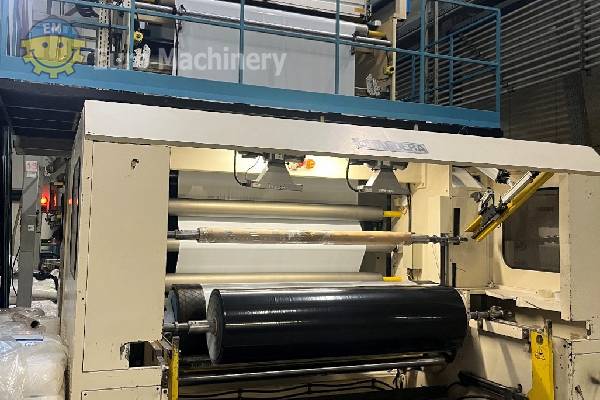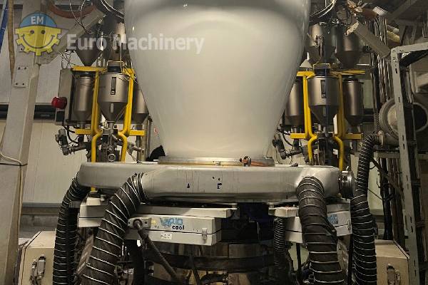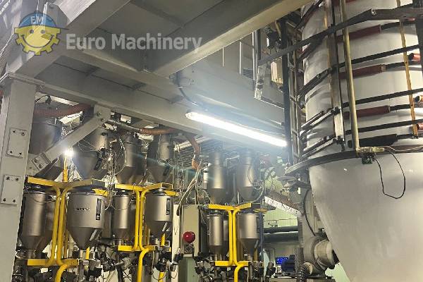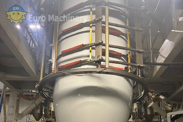 Linha de coextrusão de filme soprado de 3 camadas Bandera para a indústria de embalagem e transformação. Coextrusora de filme soprado com diâmetro de matriz 400, IBC, controlo de espessura. Marca e modelo: BANDERA Extrusoras: Filme soprado de 3 camadas Cabeça de roscar Cabeça de extrusão:- Diâmetro da matriz 400 mm