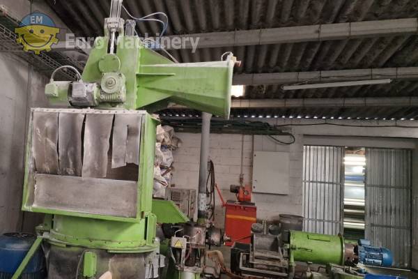 Linha de reciclagem EREMA RGA 100 para materiais PE, com um parafuso de 100 mm e uma produção até 120 kg/h. Inclui combinação aglomerador-extrusor, sistema de granulação a quente e acessórios. Marca e modelo: EREMA RGA 100 Material que pode ser processado: PE Diâmetro do parafuso: 100 mm 24 L/D Produção: Até 120 kg/h, dependendo do tipo de material e da velocidade de alimentação. Sem desgaseificação Tipo de tremonha da extrusora: Aglomerador/Cortador Compactador – Combinação de extrusor Sistema de peletização: Granulação a quente na matriz – Sistema de círculo de água Acessórios e acessórios:- Banho de água