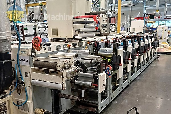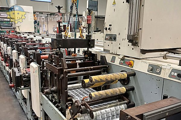 Prensa flexográfica de 7 cores sem engrenagens de alto desempenho com servo drives, optimizada para impressão em película auto-adesiva e sem suporte. Largura de impressão de 320 mm, largura de material de 330 mm, limpador de banda, tratador corona Vetaphone e sistema de secagem UV GEW completo incluído. Pronto para produção imediata.