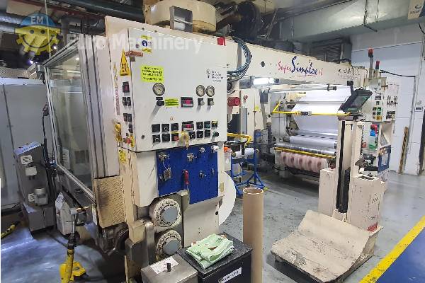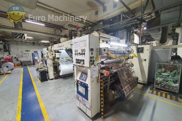 Máquina de laminação Nordmeccanica Simplex para embalagens flexíveis, laminação de película/filme e película/folha. Laminador com adesivo sem solvente de dois componentes, largura de trabalho de 1315 mm. Marca e modelo: Nord Meccanica S.SIMPLEX SL 1300 Sistema adesivo: Adesivo sem solvente de dois componentes Material: BOPP, PET, CPP, LDPE, LLDPE, OPA, Nylon, Folha de alumínio, Papel Aplicações: Embalagens flexíveis, laminação de película/filme e película/folha Largura máxima da banda: 1300 – 1330 mm Largura de trabalho: Aprox. 1315 Largura mínima da banda: 600 – 650 mm Velocidade máxima: 350 (até 450 dependendo da configuração) m/min Desbobinador: Sem eixo Rebobinador: Sem eixo Diâmetro máximo da bobina: Até 1000 mm Peso máximo do carreto: 600 – 1000 kg Sistema de acionamento: Accionamentos vectoriais AC / servo-motores Controlo da tensão: Controlo digital independente da tensão Sistema de revestimento: Gravura / revestimento de rolo liso Acessórios:- Tratador Corona