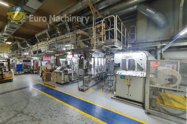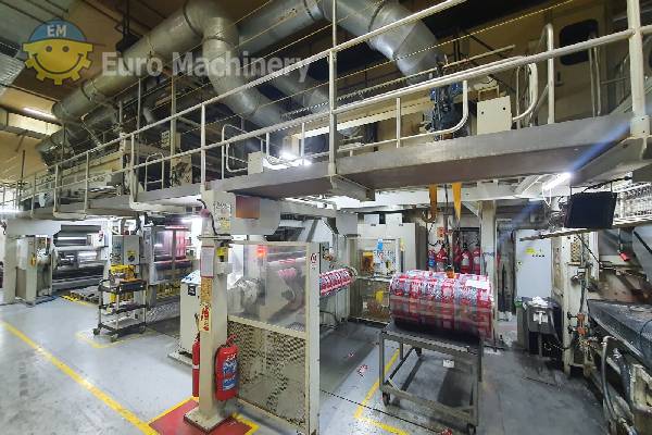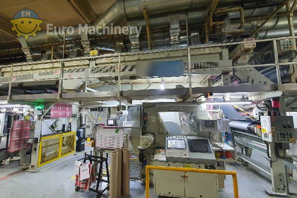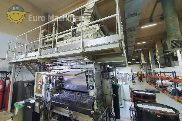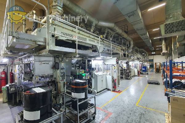 Máquina de laminação triplex ROTOMEC para processar Lam/Coat/Lat. Laminadora Rotomec para trabalhar com banda de 650 mm a 1320 mm e velocidade mecânica em torno de 350 m/min. Marca e modelo: ROTOMEC TRIPLEX 1320 350 Processa: Lam/Coat/Lac Largura máxima da banda: 1320 mm Largura mínima da banda: 650 mm Desenroladores de bobinas diâmetro máximo: 1000 mm Bobina de desenrolamento Diâmetro do núcleo: 3” – 6” Desbobinadores de bobinas peso máximo: 1200 daN Diâmetro máximo da bobina do enrolador: 1300 mm Diâmetro interno do núcleo do rebobinador: 150 mm Peso máximo da bobina do enrolador: 1750 daN Aquecimento: Indireto por óleo térmico Temperatura mínima do óleo: 210 °C Número de secadores: 2 Velocidade mecânica máxima: 350 m/min – 250 m/min Acessórios:- Descarga eletrostática