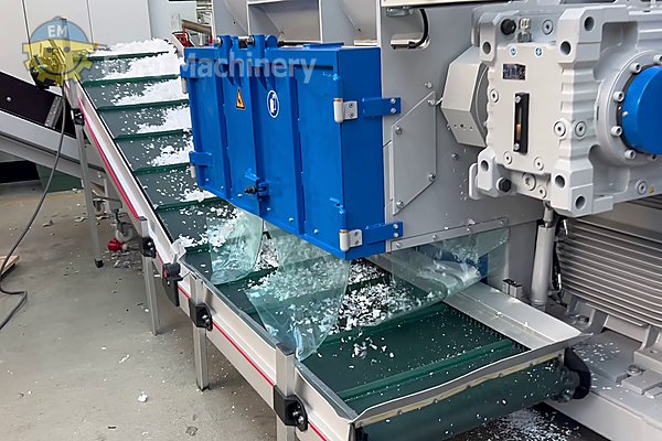 Triturador de eixo único de nível profissional com um rendimento de 800-1000 kg/h com 102 facas de rotor de precisão, ideal para a reciclagem de película PE e redução de material. O sistema completo inclui o transportador de carga, o detetor de metais e o transportador de descarga para uma integração de produção chave-na-mão.